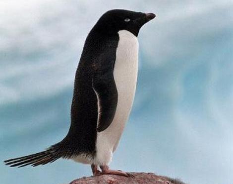 The Adelie Penguin is one of the most easily identifiable Penguin species with a blue-black back and completely white chest and belly. The head and beak of the Adelie Penguin are both black, with a distinctive white ring around each eye. The strong, pink feet of the Adelie Penguin are tough and bumpy with nails that not only aid the Adelie Penguin in climbing the rocky cliffs to reach its nesting grounds, but also help to push them along when they are sliding (rowing) along the ice. Adelie Penguins also use their webbed feet along with their small flippers to propel them along when swimming in the cold waters.