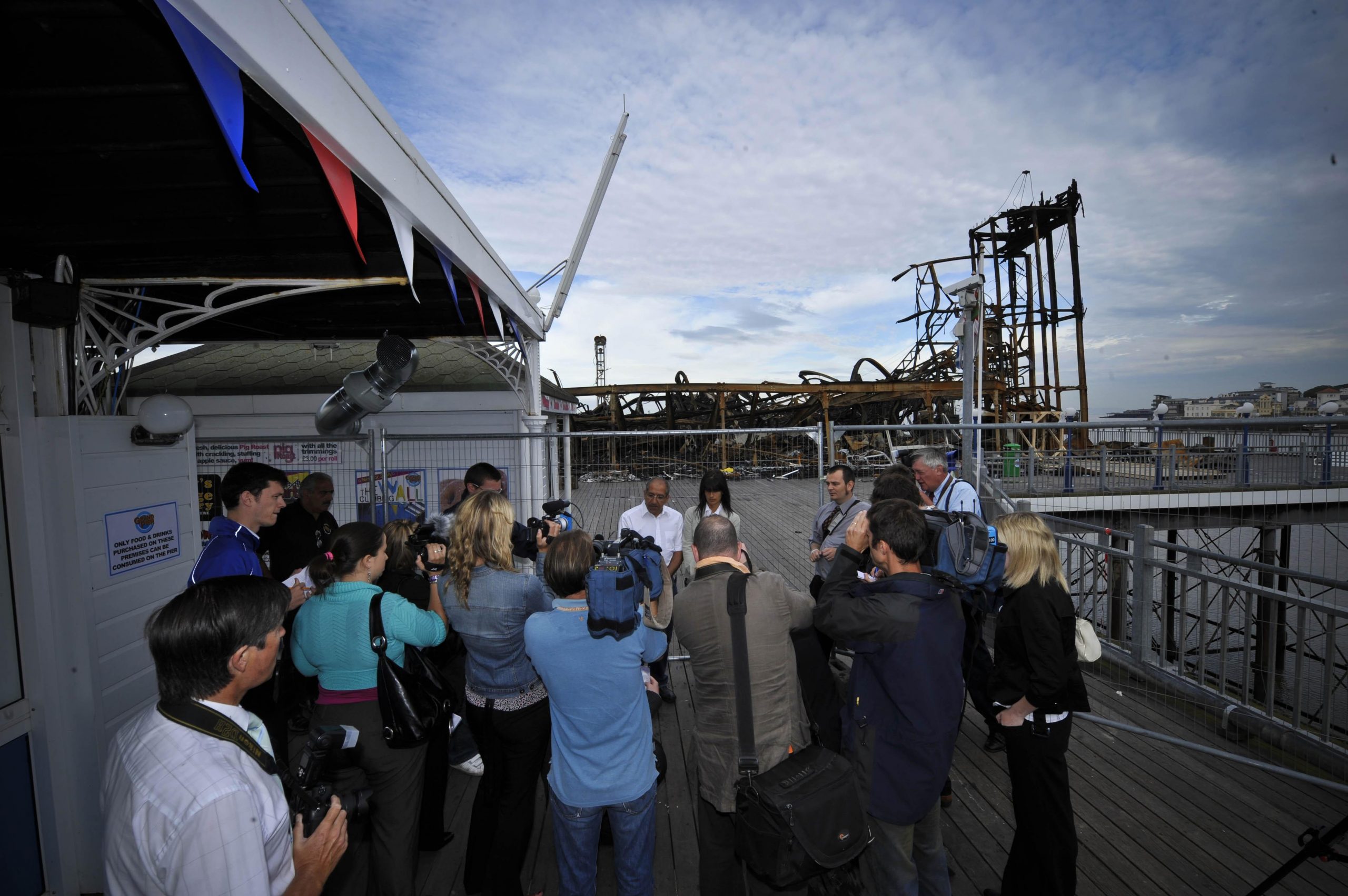 The first BBC representatives reported at 0805 BST and stated that flames were reaching 100 feet in the air, with the column of smoke reaching hundreds of feet higher still. It was apparent that the pier was collapsing in on itself and in the reporter”s opinion, the pier would be completely destroyed especially as there were reports of several small explosions.